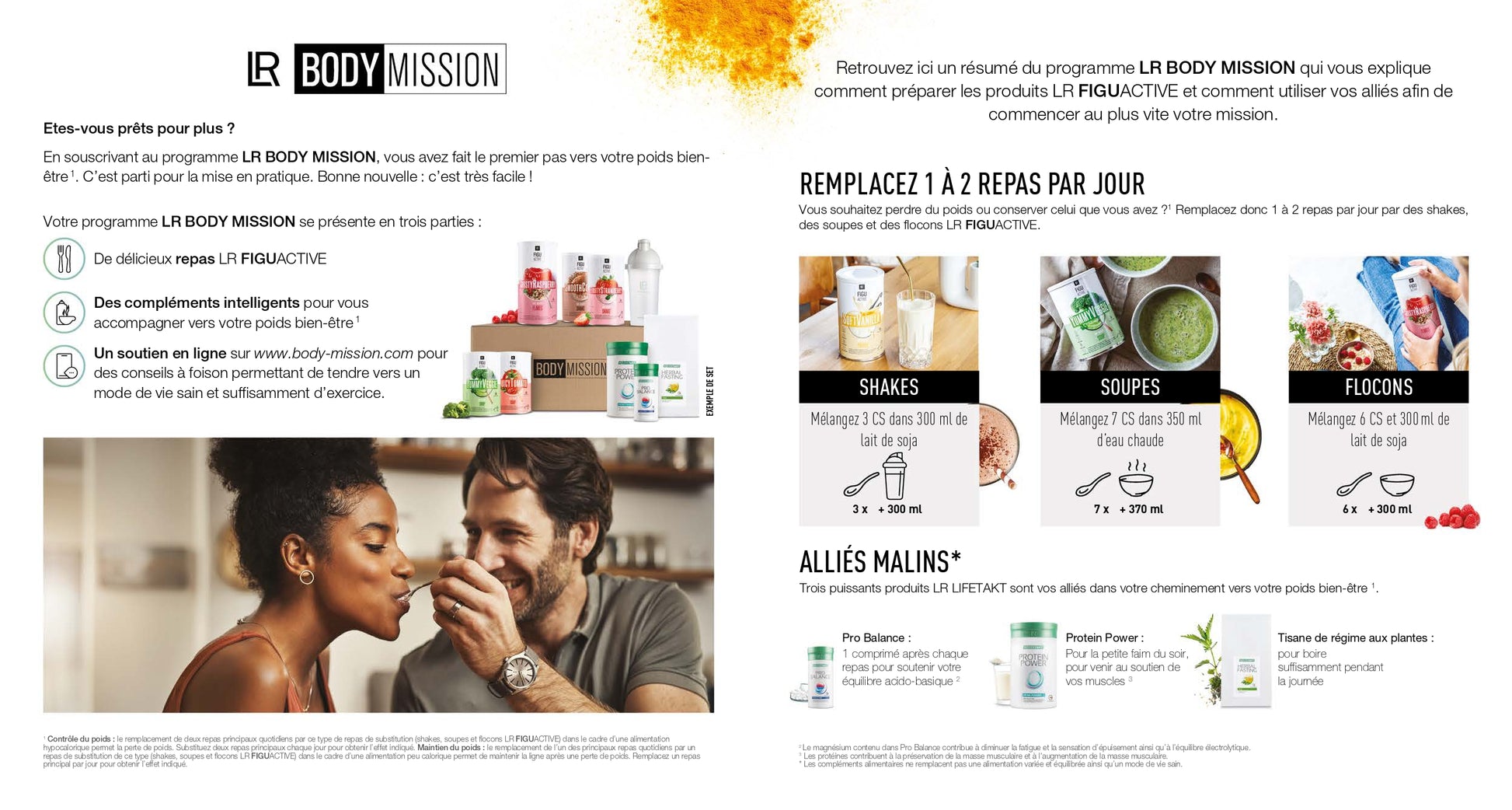 Contrôle du poids : le remplacement de deux des principaux repas quotidiens dans le cadre d'un régime hypocalorique par un tel substitut de repas (LR FIGUACTIVE Shakes, Soupes et Flakes) contribue à la perte de poids. Pour obtenir l'effet indiqué, il convient de remplacer deux repas principaux par jour.